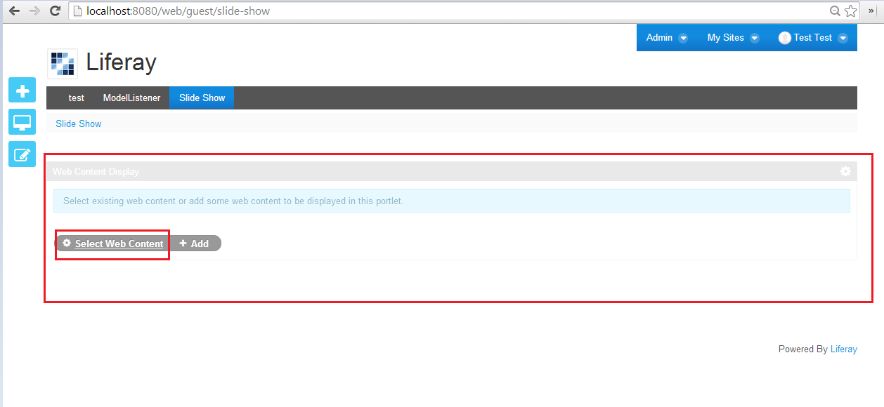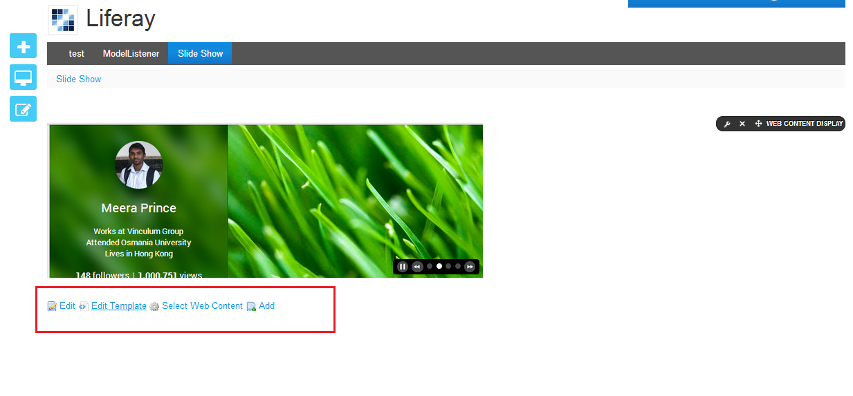 When we login as admin bottom of web content display portlet you can see edit controls to edit content and template. We can add more images, change height, width of slide show and we change slide interval time.